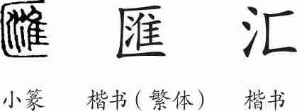 “汇”是形声字。小篆从匚,淮声。隶变后楷书写作“匯”。汉字简化后写作“汇”。