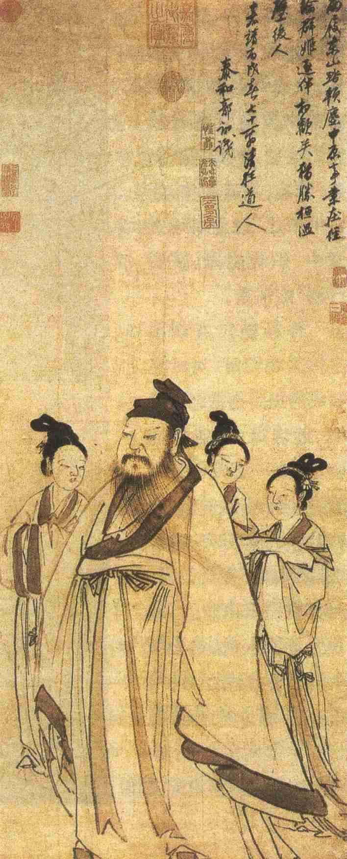 不过,郭诩此图倒也称得上是“得古人之所以思致于笔端”的逸品。画面上,谢安清须飘洒,气宇轩昂;三妓云发高耸,缓步随后,作为谢安隐逸生活的陪衬。根据主题需要,画面全以水墨勾染而成,显得淡雅古逸;线条流畅舒放,劲健有力,为谢安逍遥自适的形象塑造倍增丰采。右上有郭诩题诗云:“两屐东山踏软尘,中原事业在经纶。群姬逐伴相欢笑,犹胜桓温壁后人。”实际上是借谢安的故事,自寓逍遥豪迈、情狂不羁之意。诗后有“嘉靖丙戌春七十一翁清狂道人泰和郭诩识”落款,可知此图乃郭诩晚年手笔。