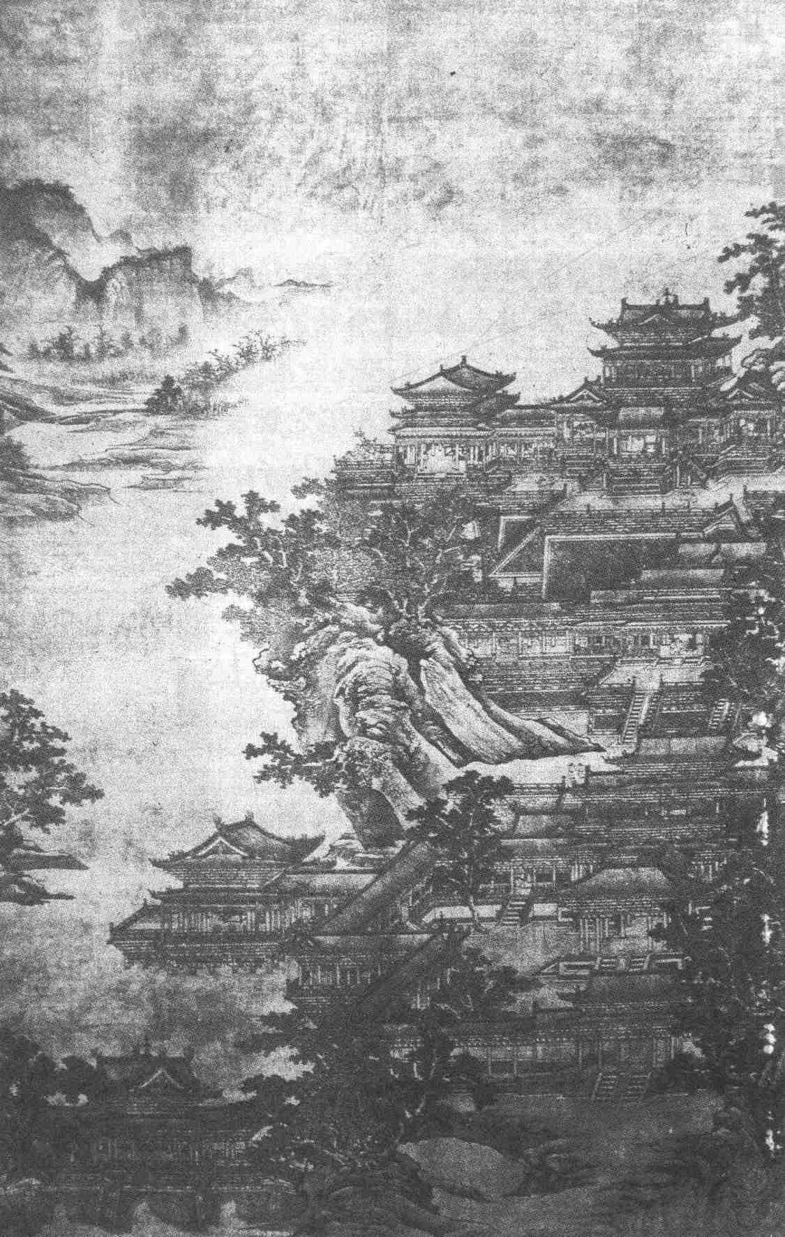 画面上,宫苑殿阁依山傍水而建,由左下角十字歇山顶的桥亭,沿山径进入第一重天井,左侧围以曲折的长廊,廊外水面上构筑一重檐歇山顶的凉亭。在凉亭稍作休憩,再向上进入第二重天井,左右两侧均以悬崖峭壁为天然屏障。第三重天井中建一高峻的台基,台面上矗立着一座巍峨的双层楼阁,上层为重檐十字歇山顶,下层檐的左、右、前方各出一歇山抱厦,斗栱飞檐,玲珑剔透,参差错落,曲折映带,高下起伏,云蒸霞蔚,真所谓“列棼橑以布翼,荷栋桴而高骧。雕玉瑱以居楹,裁金璧以饰珰;发五色之渥彩,光爓朗以景彰”(《西都赋》)。气派穷极华丽,应是这一组建筑群的主体。如果说建筑是凝固的音乐,那么,这一主体建筑不啻是奏出了全曲的高潮乐章。主体建筑的左侧是一座重檐四阿顶的殿堂;闲步殿外,凭栏俯瞰山川形胜,使人目光失落于无限的风烟冥漠之中,身际隐隐响起了汉高祖刘邦的《大风歌》:“大风起兮云飞扬,威加海内兮归故乡,安得猛士兮守四方!”