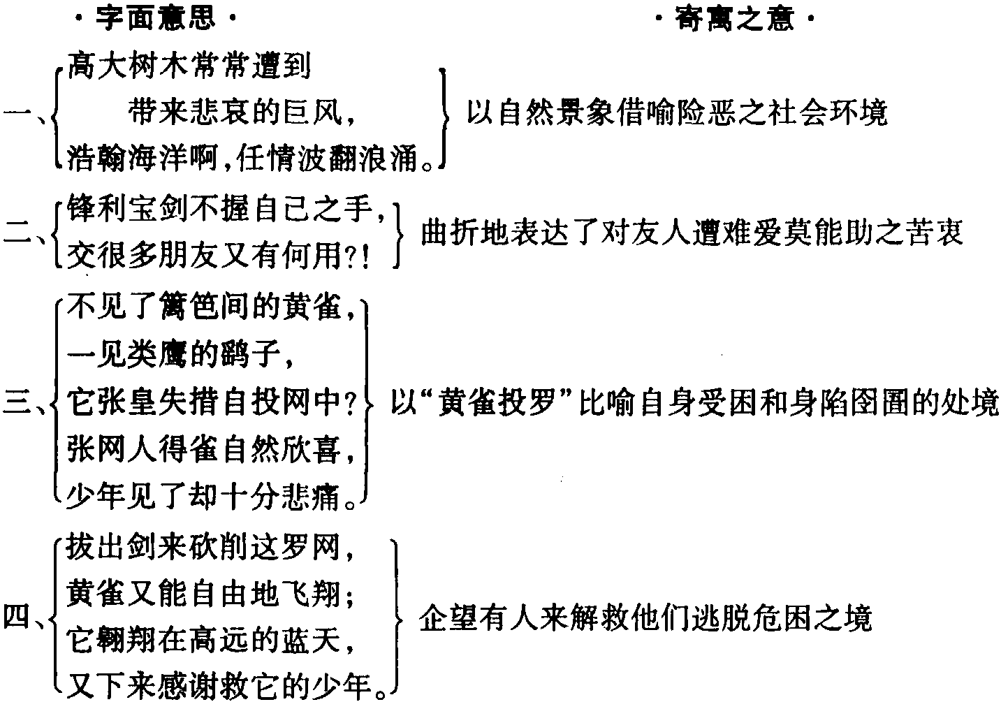 这是一篇体型较小的叙事诗。全诗通过对黄雀投罗和少年营救的描写,反映了当时险恶黑暗的社会现实,表达了诗人对朋友遇难而自己却爱莫能助的心情。