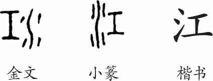 “江”是形声字。金文从水,工声。小篆整齐化。隶变后楷书写作“江”。