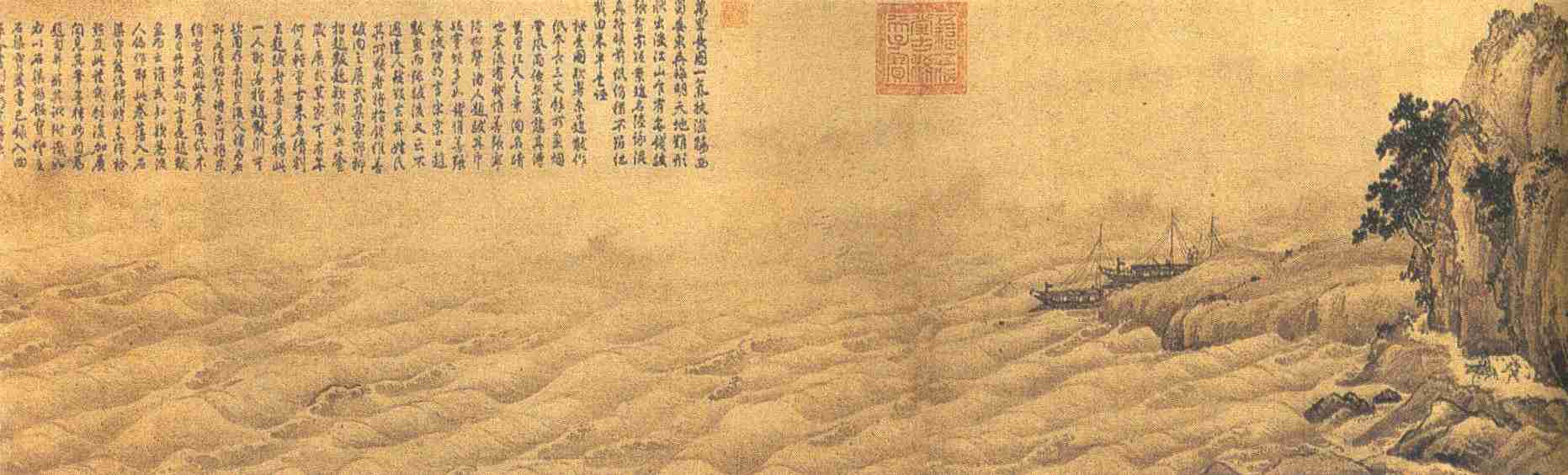到了南宋,则有赵芾的《江山万里图》卷,摒弃重彩,全用水墨。卷首是雾海苍茫,崇山峭拔,中部山脉连绵起伏,林木葱郁,夹杂枯树,悬崖曲折,山路萦绕,得幽深荒远之致。路上一人骑驴,前后两人背着行李;接着路转山回,坡石临海,势极惊险,一樵夫沿着山路走向板桥,迎着海浪。复于坡脚,作航船数艘,准备入海。这桥的上端,孤峰突起,庙宇位于山腰,一塔高耸,为山海交接的标志。卷尾大海茫茫,水天一色,气势极为宏伟。