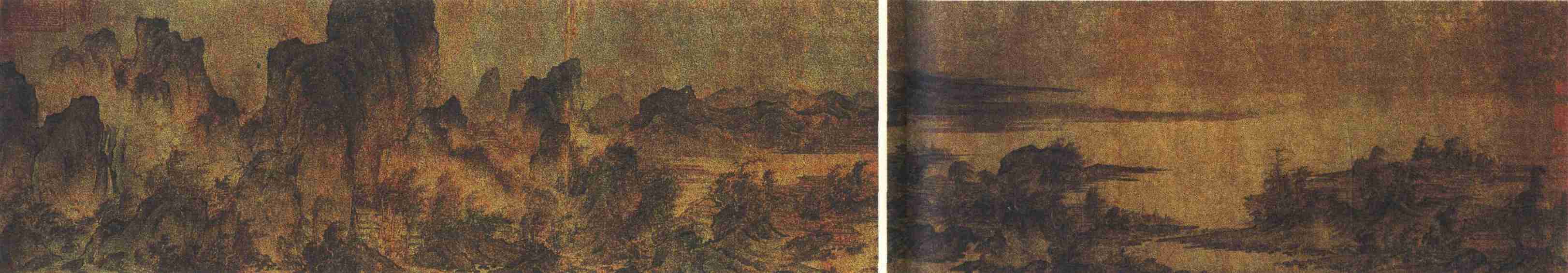 此图描写江景,气势开阔旷远。卷首写江边丘陵起伏,继以沙碛平滩,沙脚左右伸舒,近处碎石散布,杂树迎风摇曳,远处江水浩瀚。中段港汊曲折,层岩隆起,楼台水阁,隐现在水气烟树之中,隔江山峦层层远去,其下沙脚平拖,有的微微出水形成长线条,伸向右方,和前段景物若离若合,这种虚接的艺术处理,开阔画面空间,增添了大江雄姿的层次。后段主峰巍巍,峰后冈峦绵亘,烟云明灭,飞泉潺湲,一群旅人过了木桥便临深山幽谷,山坳间微微露出一段石磴,给观者以旅途悠冥的画外之想,颇见用心。宋刘道醇《圣朝名画评》称赞他的“燕家景致,无能及者”。元钱惟善《江月松风集·补遗》有《题燕文贵〈秋山萧寺图〉》曰:“忽见燕侯画,令人忆旧游。千岩开太古,万古耸高秋。石路驱轻骑,江风送远舟。人间无此境,卷舒不能休。”当有助于欣赏燕文贵的绘画艺术。