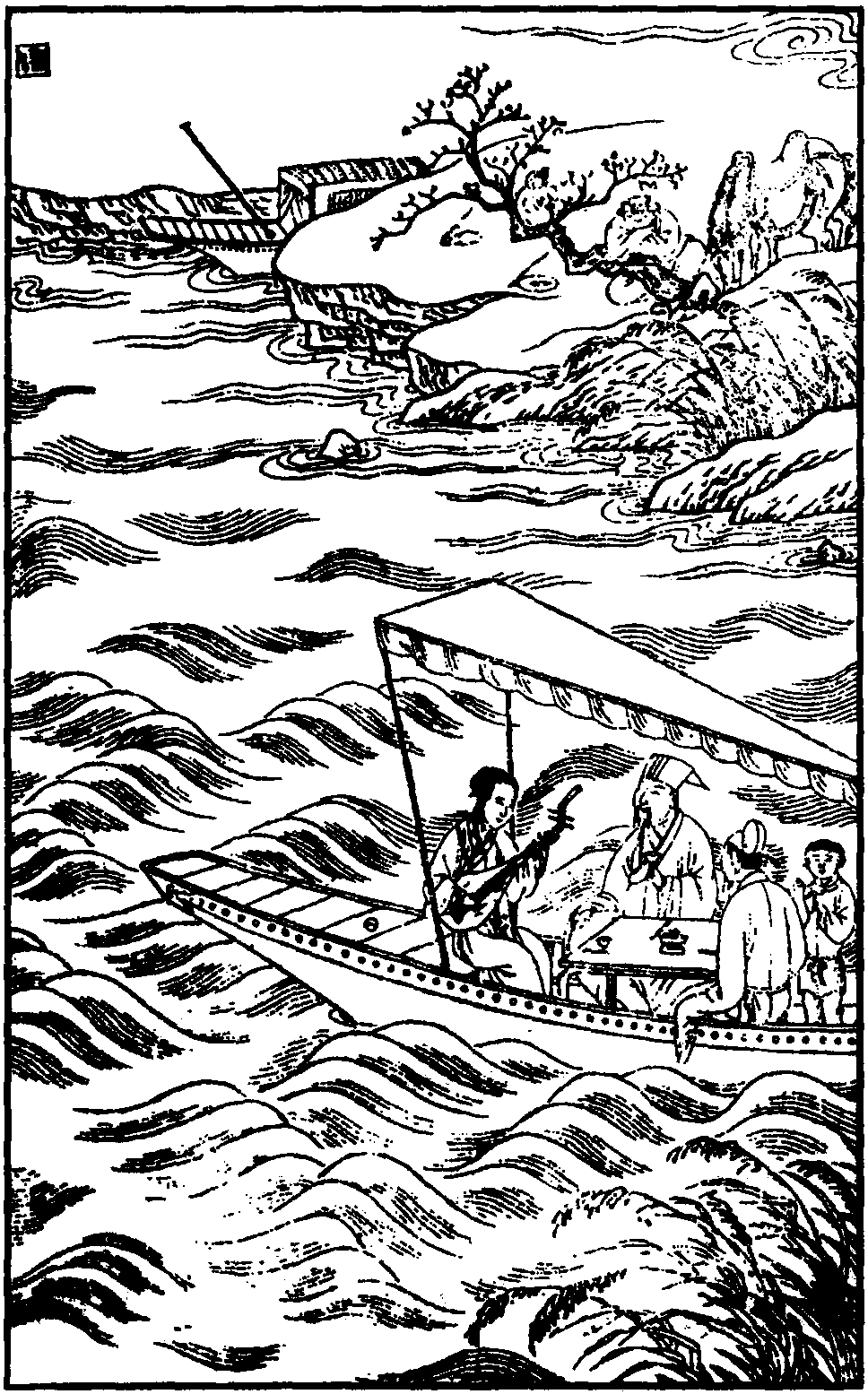 此所选是第三折数曲。裴兴奴在浔阳江船上,独坐舱中,对着这江天景物,想念故人白乐天,不禁叹息自己的命运。【新水令】 写江上景色: 在夕阳的照耀下,但见寥廓的天空,和那暮色中苍茫的江水。翠色欲滴的群山,峰岚层叠,在晴空下蜿蜒。这简直是王维笔下一幅《江天秋月图》。并且与白居易原诗中 “枫叶荻花秋瑟瑟”、“别时茫茫江浸月” 的场景吻合。景虽美,心事却逐浪起伏。“冰壶天上下,云锦树高低” 两句,是写兴奴身处船舱,船随浪起伏,从她的眼睛看出去,天上下波动,锦树也在一高一低地摇晃。同时,这两句也为了写她的心旌摇动,思绪万千。这才有最后 “谁倩王维”两句,为的是写一个 “愁” 字。