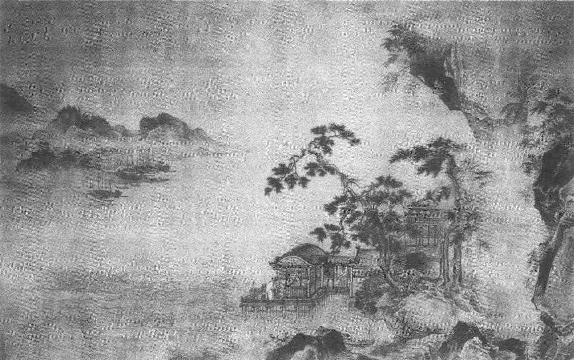 画面描写江阁远眺的平远景物。近处右下角,石壁悬崖,长松虬曲,姿势挺健。江边亭榭楼阁,依山傍水,廊庑回环。阁外一人仰首伫立,眺望远方,两童随侍左右。窗间人影依稀,隐约可见。远处隔江对岸,云雾迷漫之中,峰峦起伏,山城环抱,舟船停泊。中间一片江波浩渺,水天空阔,横无际涯。画幅的构图,采用了南宋马远、夏圭山水画的结构方法,取景布势,简括爽朗,不作崇山峻岭、楼台殿阁等层层繁复的全景式布局,而是对周围的景物加以剪裁取舍,着意经营,把选择好的局部环境,布置在一个角落,使要表现的场景更加集中,主题更加突出。画中近景的亭台水榭和对岸的山城远景,各分布在两个角落,遥遥相对,中间大部分篇幅是一片空濛,辽阔无垠,表现了一派平远开阔的气势,令人望去心旷神怡。