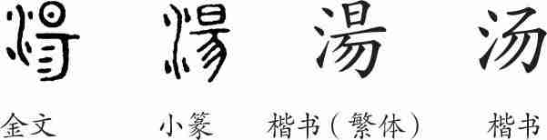 “汤”是形声兼会意字。金文和小篆皆从水,昜声,易兼表热之意。隶变后楷书写作“湯”。汉字简化后写作“汤”。