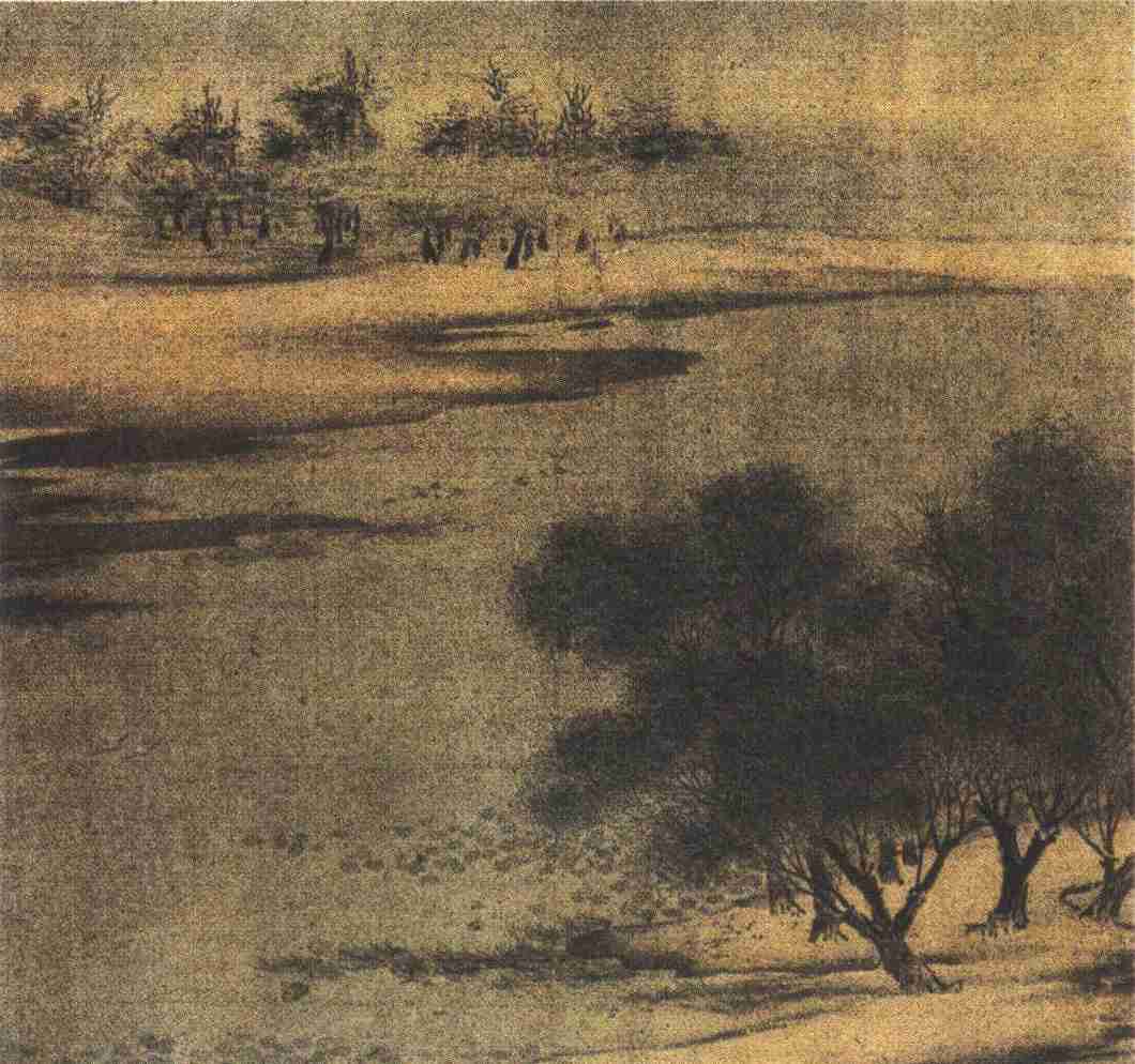 惠崇作品著录于诸家诗文集的屡见不鲜,但诗存画亡,十分可惜。本图《沙汀烟树图》相传是他的作品,从画风来看,比较接近。