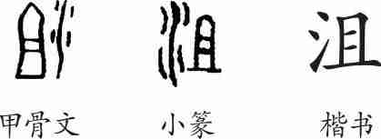“沮”是会意兼形声字。甲骨文从水,从且(表置放),会水停注的低湿烂泥地之意,且兼表声。小篆左右调换并整齐化。隶变后楷书写作“沮”。
