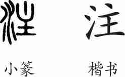 “注”是形声兼会意字。小篆从水,主声,主兼表集中之意。隶变后楷书写作“注”。
