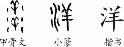 “洋”是会意兼形声字。甲骨文从水,从二羊,会水多之意。小篆从水,羊声。隶变后楷书写作“洋”。