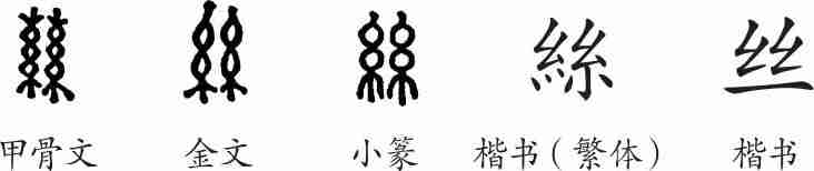“丝”是象形字。甲骨文像两束蚕丝。金文、小篆直接由甲骨文演变而来。隶变后楷书写作“絲”。汉字简化后写作“丝”。