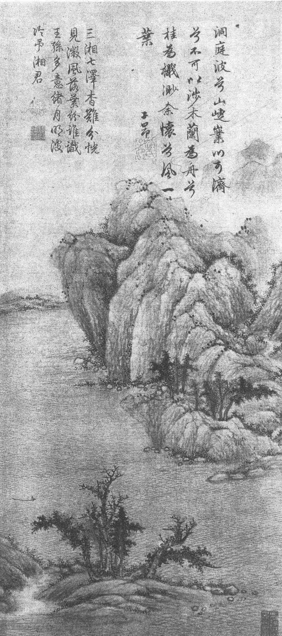 在画幅右上部,有赵孟頫自己的四句题诗:“洞庭波兮山崨嶪,川可济兮不可以涉。木兰为舟兮桂为楫,渺余怀兮风一叶。”这应画幅湖面风帆及坡岸上老者景象而写。“川可济兮不可以涉”,这是作者在隐喻现实的政治生涯,只能用以济渡而不可以深涉,它是出于一个有一定涉世经验人的口吻。赵孟頫在仕元之后,确实做了几件有益于国计民生的好事。他没被当时种族压迫政策所吓倒,而且能正直又策略地与有权势的蒙古、色目人周旋,处境是十分险恶的。他也明白“在山为远志,出山为小草”的世俗之见,但由于“王事有裨益,宴安非所求”的思想境界,不惜“毛羽日摧槁”。然而对江南田园的怀念,依然不时从他诗简里流露出来。他无意在宦海浮沉,所以从这幅画的创作思想看,应在他“力请补外”暂还江南的这段时间之后,估计在至元三十年(1293)他四十岁左右。在画风上与《鹊华秋色图》创作时间相去不远。题诗的书体尚属娟秀清丽,不脱智永、赵构“千字文”模式,而缺乏他后期的珠圆玉润,这也和他四十岁前后的书风吻合。