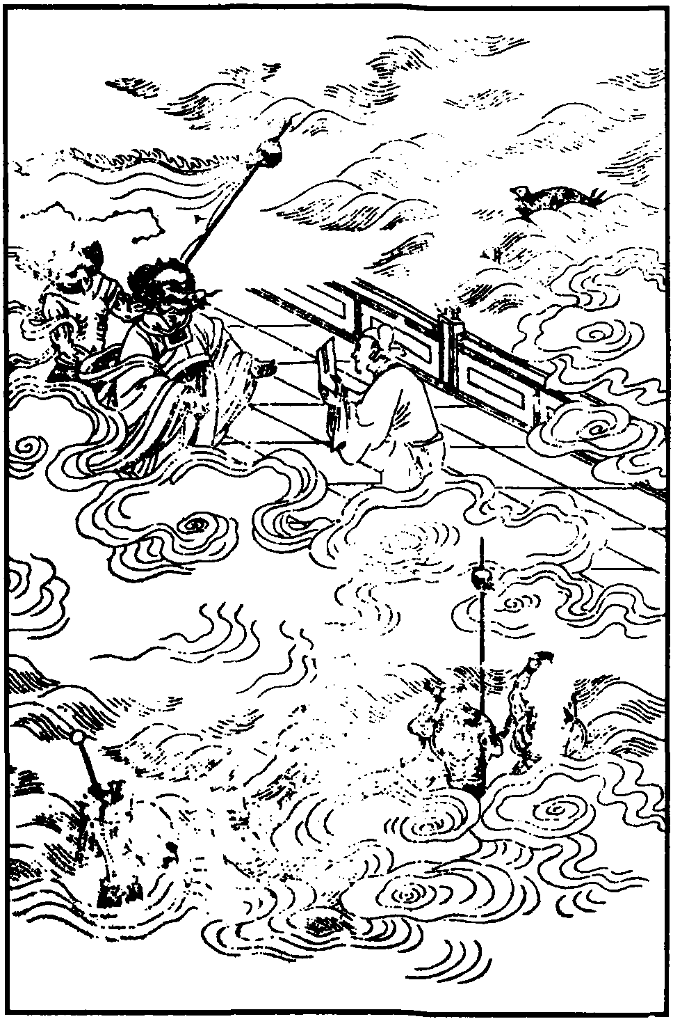 【紫花儿序】 忽的呵阴云伏地,淹的呵洪水滔天,腾的呵烈火飞空。泾河龙逃归碧落,钱塘龙赶上苍穹。两条龙的威风。怕不喊杀了鳖大夫,龟将军,鼍相公。这其间各赌神通。早翻过那海岛十洲,只待要拔倒了华岳三峰。