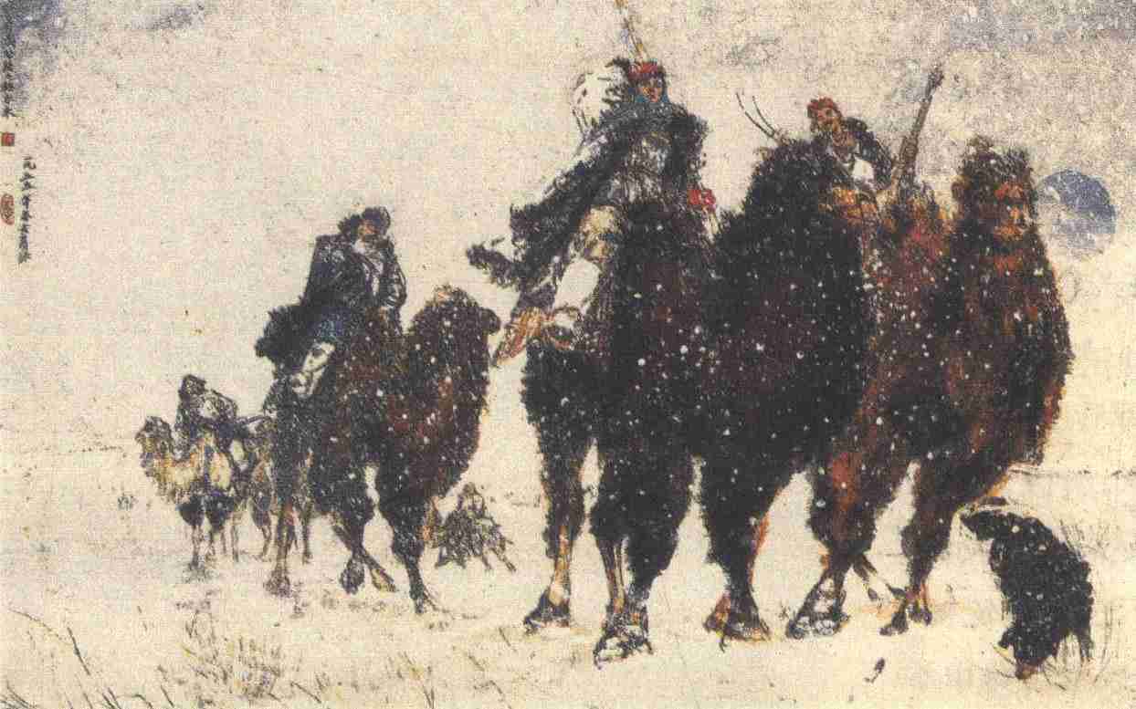 《洪荒风雪图》,画的是在大西北漠朔空旷地有一群少数民族青年旅者(看来似系测量队)骑着骆驼,冒着漫天风雪行进在旅途上。图为长方横幅,行进的驼队悉置在纸中央,占得满满的。作者采低角度视线安排画面结构,近景镜头拉得很近,两匹骆驼迫近观者眉睫,高耸逼人,驼上跨坐一男青年弹着冬不拉,女骑手持长杆测量尺,斜靠肩膀,似在歌唱,洋溢着青春活力。一小黑犬前导,大小相比,显得骆驼的庞大魁伟。稍后紧随一驼,驼躯小了些,骑者后顾远眺,似在想些什么。前两个驼骑是动的、活跃的,后一个驼骑是静的、悠闲的,显出画面处理的差别美。再稍后,远了点,尚有二驼骑,一斜出第三骑的右面,一嵌在二、三骑的中隙。如此错落、高低、远近来安排一个小小驼队,显得穿插有致,紧凑有序,这是作者的聪明,颇见匠心。画面天地间空旷无垠,作者采用浅浅的淡灰蓝色调,轻轻烘染全图上下,然后以白粉点聚散弹落于画面上,组成了一个银世界、一个玉山河。《洪荒风雪图》是一件别出蹊径的新颖好画。