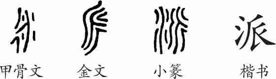 “派”是会意字。甲骨文左边为“彳”,右边为河的干流,周围的四点表示水。金文像河流的主干分出一条支流。小篆增加了义符“水”。隶变后楷书写作“派”。
