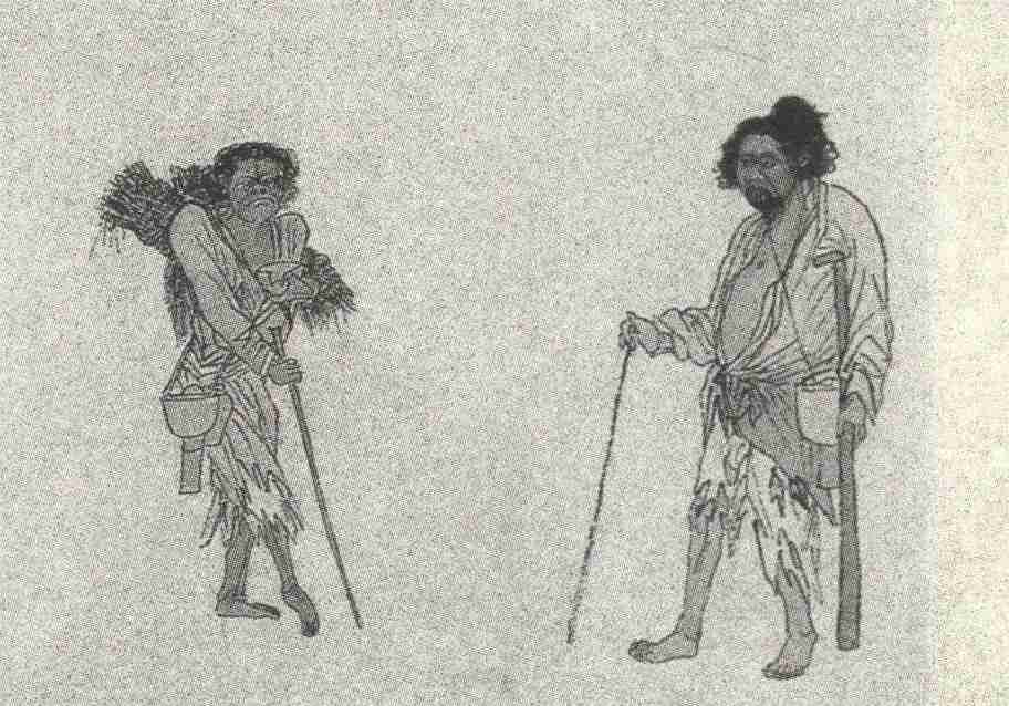 图册共十二开,画有二十五个乞丐形象,基本上是一开两人,无任何背景。所画老、幼、妇、壮均有,其中一部分是身有残疾、完全丧失劳动能力的人,一位双足俱坏、爬行在地的老妇,似乎在向路人跪拜乞求哀悯。一位双目失明的瞎子,靠狗来引路,已足堪怜,而与之相邻的一位瞎眼婆婆,就更令人见之酸鼻,她不但双目失明,一足痈疽溃疡不利行动,而且怀中还有一个呱呱待哺的婴儿。另一部分尚有一些劳动能力,但由于长期缺食,严重营养不良,只剩皮和骨,形同枯槁。他们无论得到什么食物,都是狼吞虎咽,甘之如饴。另一部分人则不甘心完全乞讨,多少靠一点自己力量,或驯服蛇、松鼠、猴等动物,当众表演;或持竹板,挎小鼓,唱莲花落。另外有两人脸上都化了妆,一黑一白,足着麻鞋,可能是装扮民间传说中勾魂使者黑、白无常,是为人家办丧事而来的。内中还有一僧一道,僧人托钵化缘,道士怀抱鱼鼓,唱道情,实际都是乞丐。还有两个女性,一较为年长,一正在妙龄,较之其他乞丐,她们不但衣服整洁,而且眉目清秀俊丽,然而却背负包裹,匆匆路隅,显然她们原来生活并不困难,是在特殊情况下被迫过着行乞生活。那么作者为什么把这些不同的乞丐集中起来加以描绘呢?周臣自己题跋中说:“正德丙子秋七月,闲窗无事,偶记素见市道丐者往往态度,乘笔砚之便,率尔图写,虽无足观,亦可以助警励世俗云。”“正德丙子”为正德十一年(1516)。周臣是吴郡(今江苏苏州)人,未闻其远游,“素见市道”,应当是指当时的苏州地区。民谚云:“上有天堂,下有苏杭。”“天堂”尚且如此,全国其他地方可想而知。