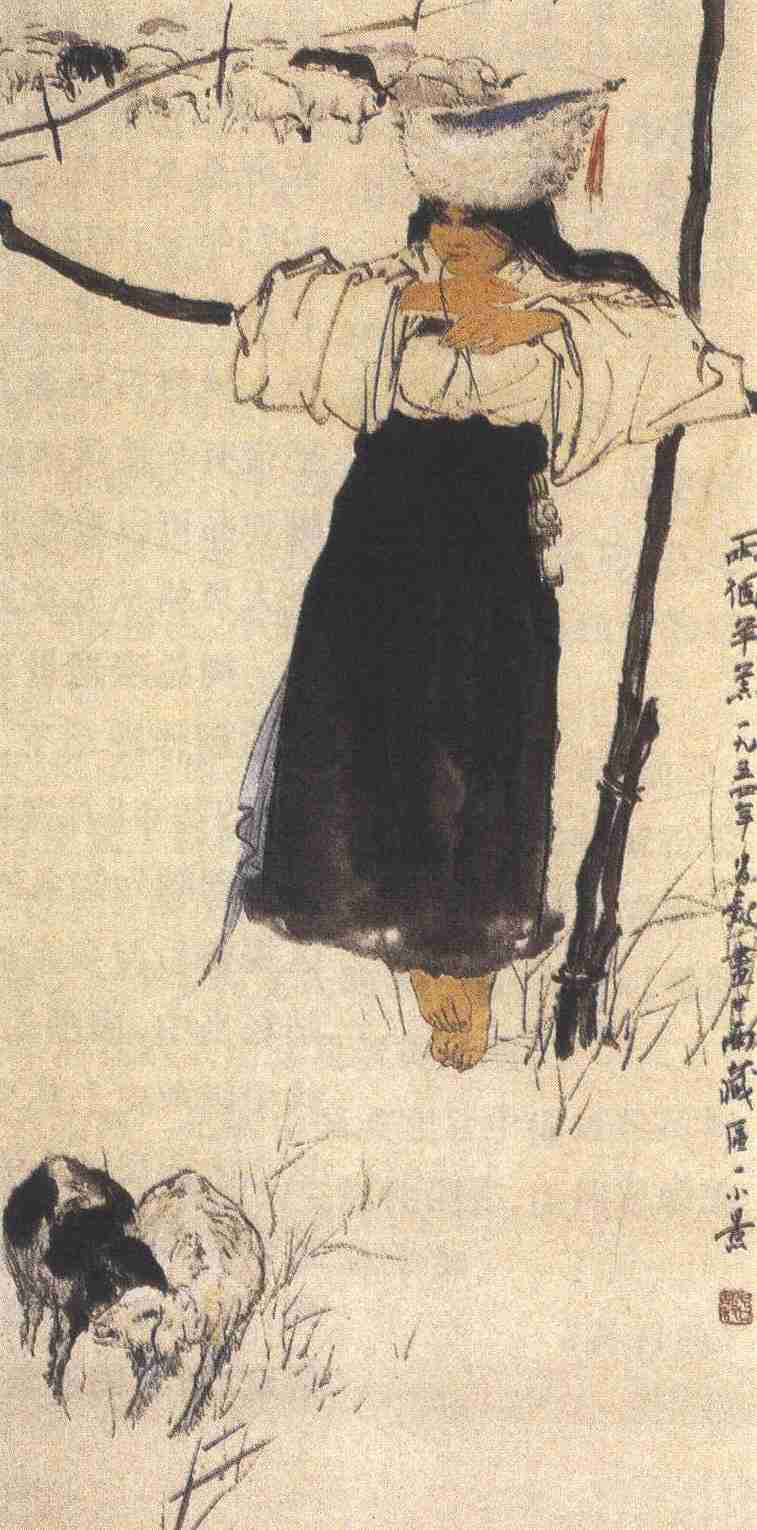 《两个羊羔图》是周昌谷1954年的作品,也是他的代表作品之一,曾获第五届世界青年联欢节金质奖章。画面描绘甘南藏区的一位牧羊少女与一黑一白两只小羊羔。少女赤足,背倚木栏,口衔一茎草叶,注视羊羔戏耍,意态悠闲。画中人物虽然采用西画式造型,但脸部及手皆不用干笔皴擦,更不画成素描样式,只在眼窝等处用湿笔一点,然后用湿润的颜色表现,显得秀润、清淡。人物身上黑衣裙的线条及大笔墨均来自写意花鸟画的笔法,如画大荷叶一般水墨淋漓。衣裙着色偶有空白处,但这空白处是“见笔”,不是留出高光点,当然有时“见笔”处也正与光亮处相合。这些都与北方“京派”人物画以素描为基础,用干笔画出素描效果,用墨厚重的作风相去甚远。
