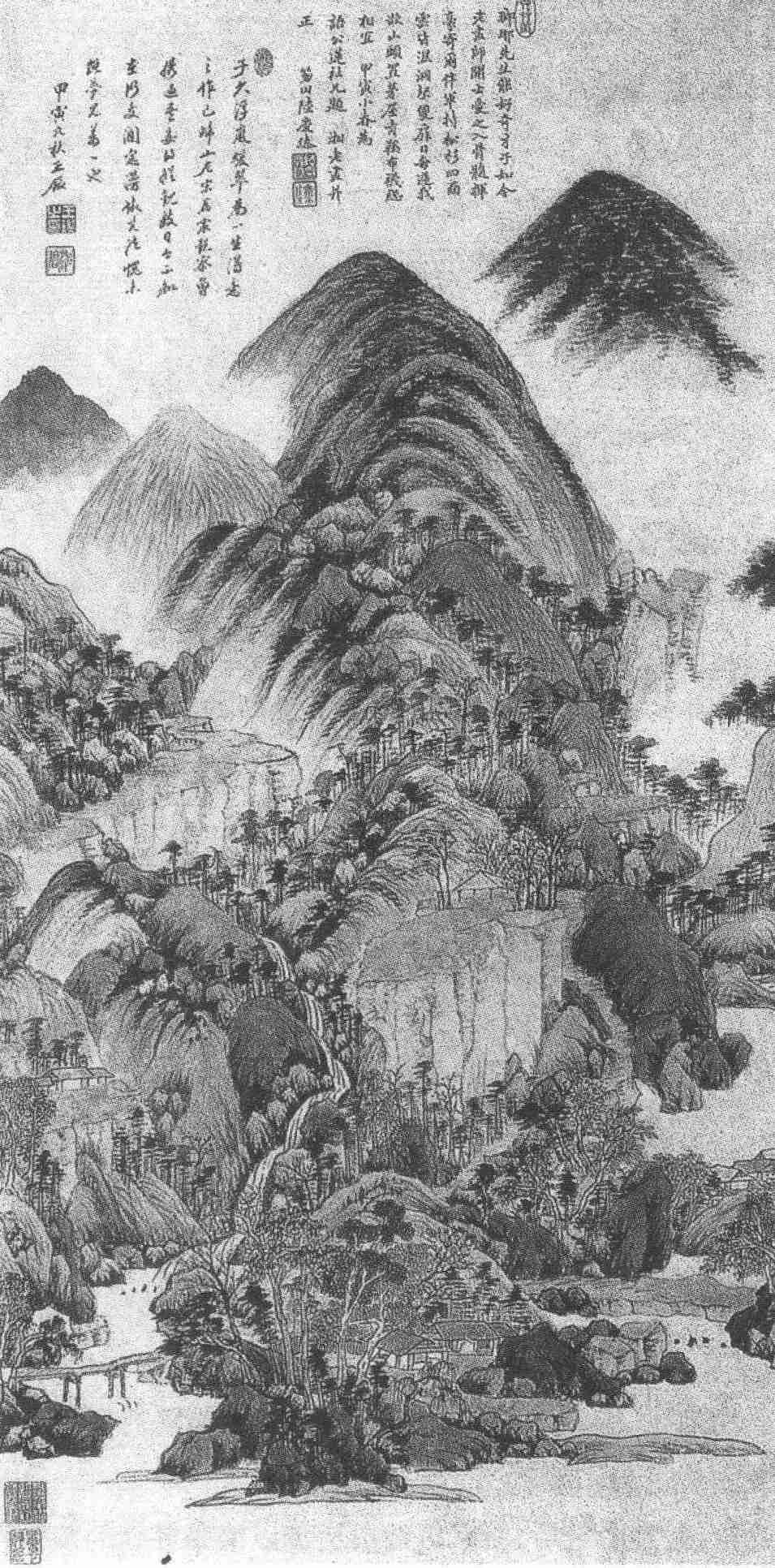 在画完树、皴完山之后,画家再对山峦加以淡墨轻烟的渲染,并点上疏密错落的苔点,以概括地表现近处的丛草和远处的丛树。以浓黑凝重的苔点来衬托淡岚轻烟,浮岚暖翠的神态便跃然纸上了。