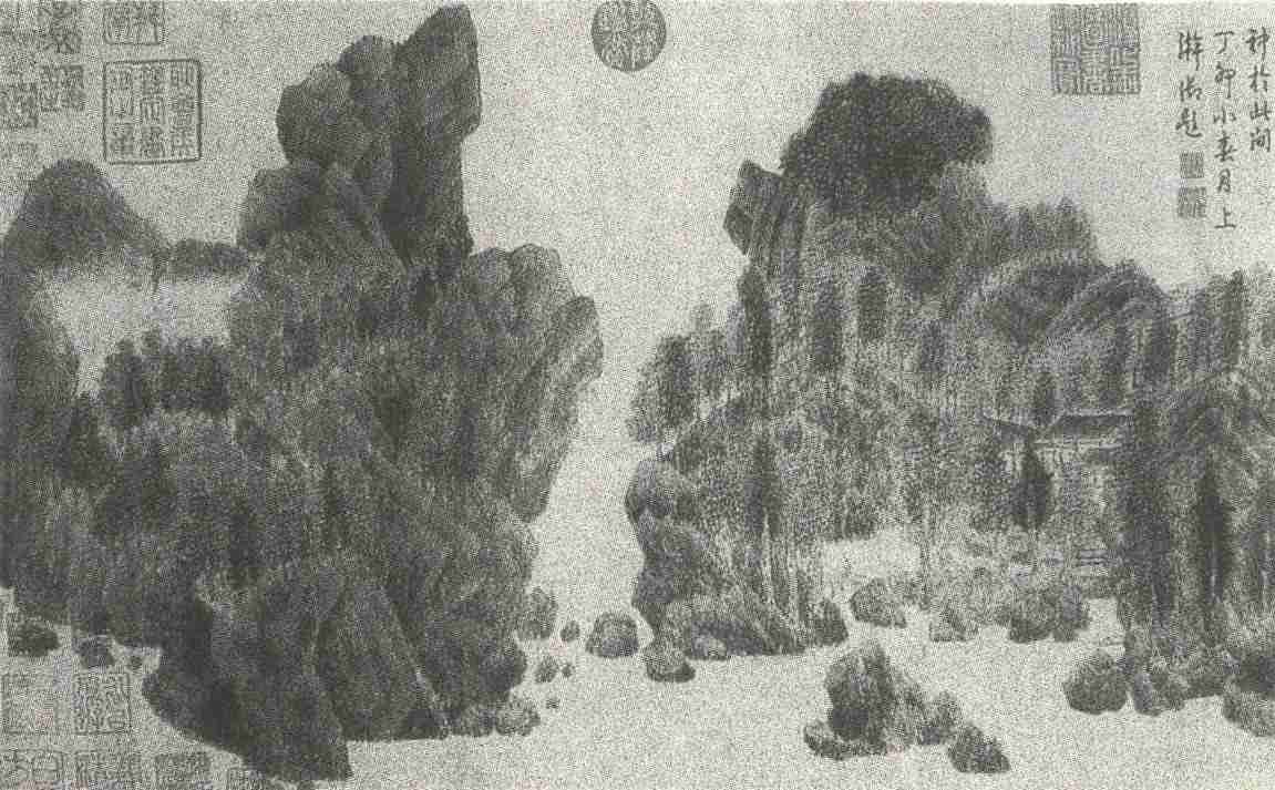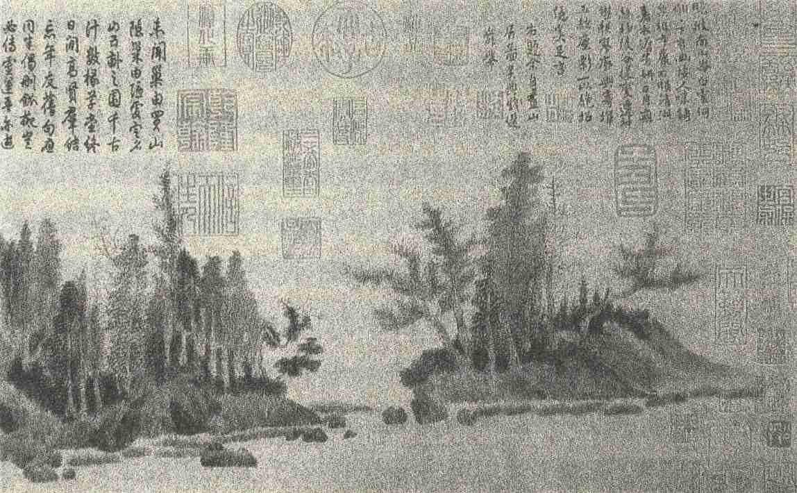 钱选的山水画,以青绿重色为多,此卷笔意雅淡,画境静穆,虽是设色画,而给人的感觉却是水墨画趣。山石皴法,全用墨笔细线画成,略施以淡墨渲染,表现了山石的阴阳向背;茂密的丛树和小草,用花青拂敷,清逸秀润。用笔工细而不刻板,柔中有刚,寓巧于拙,别具一种沉着、庄穆的意趣。赵孟頫评此卷云:“虽规摹北苑,然自成一家,可谓前无古人。”梵琦楚石诗跋云:“舜举偏工着色山,如斯水墨画尤难。苍茫云树烟霞外,合作营丘老眼看。”明姚绶跋云:“观此图七分用墨,三分设色,笔法绝类辋川,复入顾恺之之域。”这说明钱选的画法不是囿于一家一法,而是融合诸家之长而参以己意,重在创造,赵孟頫说他“自成一家”,是有道理的。