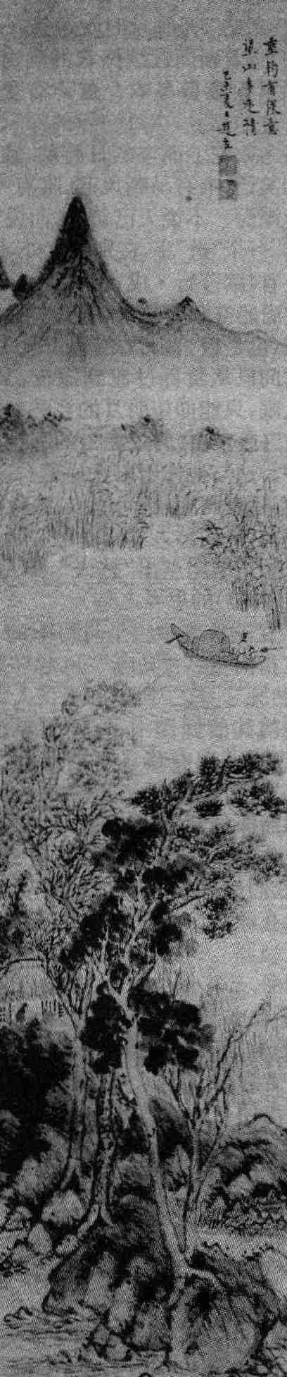 注释 ①丹青:丹、青分别指朱红色和黑色。此处侧重指黑色。②幡(fān):旗子。③舣:使船靠岸。《文选·左思<蜀都赋>》刘逵注“舣轻舟”:“应劭曰:‘舣,正也。’一曰,南方俗谓正船回济处为舣。”④葑(fēng):菰根,即茭白根,生长在池沼中。⑤津亭:古代建于渡口旁的亭子。⑥渺渺:辽远的样子。⑦获(dí):植物名。多年生,草本,形似芦苇,生于水边,秋天开花。