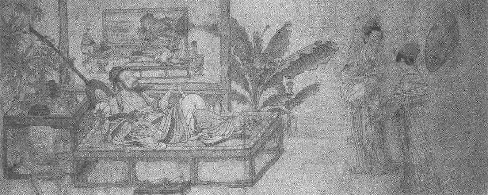 《消夏图》在图卷中略偏左处,画一士大夫斜倚在床上,右手持麈尾,左手似拄一卷轴,右腿盘在左腿上。床的左方为一方几,上置简册、砚台、花瓶等物,乐器阮咸斜靠在几上。床后摆一大屏风,屏风上画一高士坐床上,床后又画一屏风,上画山水,真是画中有画。两旁种有绿竹、梧桐、芭蕉。画卷右方约占三分之一处,画两女侍者,其一年龄略长,双手捧一包袱;另一略幼,手持长柄扇,似在对语,她们手中所持物与对语内容,显然与士大夫有关,并借此互相联系。这一构图与今传唐孙位《高逸图》、五代周文矩《重屏会棋图》、王齐翰《挑耳图》略为相似而有所变化,可以看出其前后的继承关系。所画士大夫,体态闲适,却又皱眉作有所思的表情,刻画细致。侍女面容神情也娴丽相宜。衣纹属铁线描,而流畅圆熟。从造型到用笔、着彩,都充分表现了作者绘画的高度技巧,是元代人物画的上乘之作。有小书款题“贯道”两字在竹枝空隙处。