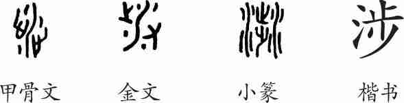 “涉”是会意字。甲骨文像一条河流。金文与甲骨文的形体基本相似。小篆左右两边都是“水”,中间是个“步”(上下两只脚)字。隶变后楷书写作“涉”。