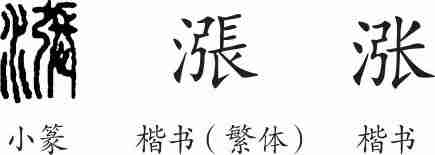 “涨”是形声兼会意字。楷书繁体写作“漲”,从水,張声,張兼表张大之意。汉字简化后写作“涨”。