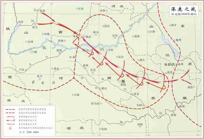 公元前3000年前后,中原地区的黄帝族和炎帝族为首的部落联盟,共同击败并消灭海岱地区蚩尤族为首的部落联盟的原始社会末期规模最大的一次战争。