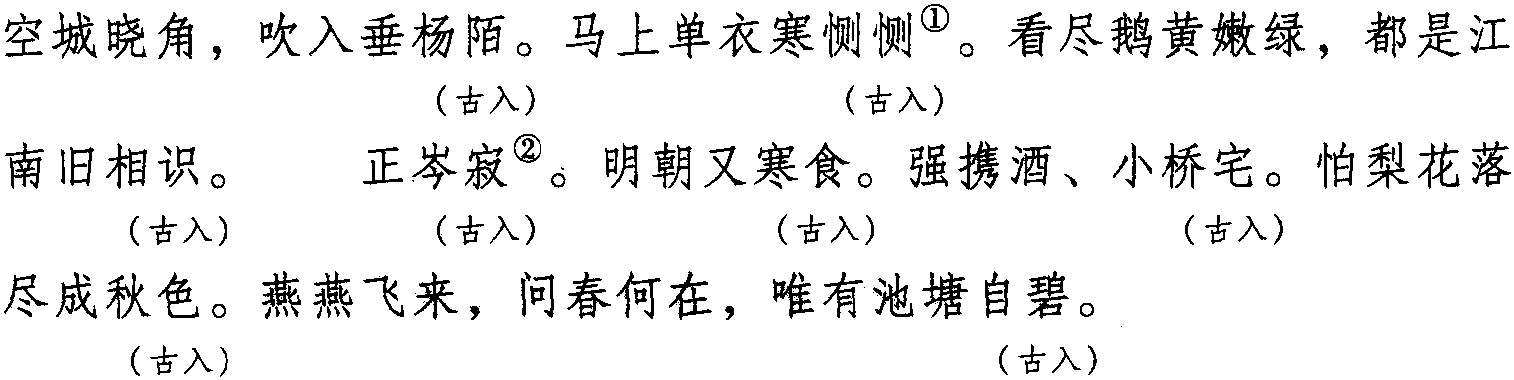 注: 一、本词例押古入声“陌” “锡” “职” 韵。因 “陌” “锡” “职” 在古韵中与“碧” “寂” “力” 同韵,而“碧” “寂” “力” 在现代韵中属“衣” 韵,故全调可押衣部“衣” 韵。