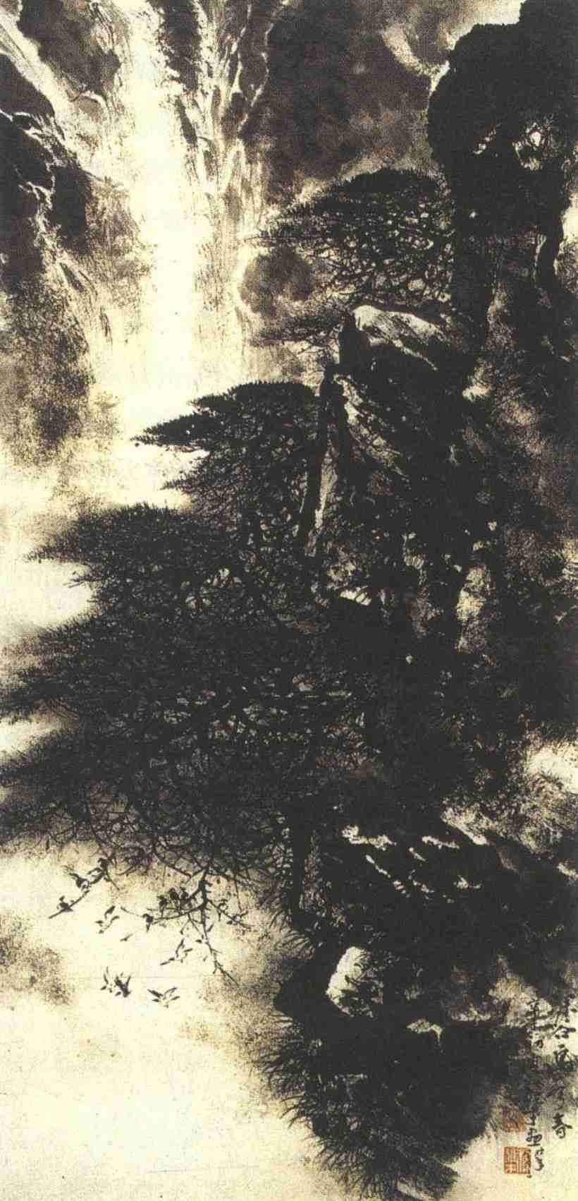 这幅作品描绘的是大自然生机盎然的春天景象。在构图上,中部的松树和右侧的山石占了画面的主体,浓重的焦墨,显示了松石的厚重质感;左上的瀑布,飞流直下,大片的空白,与山石、松树形成了明显的反差,使山石、松树更富有视觉冲击力的同时,点亮了画面;画面左下的大片留白,配合着周边的淡淡渲染,以无当有,虚实互生,暗示了渺然无底的深谷;近二十只小鸟在这里欢快嬉戏,自由飞翔,歌唱春天,这一块在画面上占的面积虽不大,但却是整幅图的“画眼”,夺人眼目,昭示了大自然的无限生机。