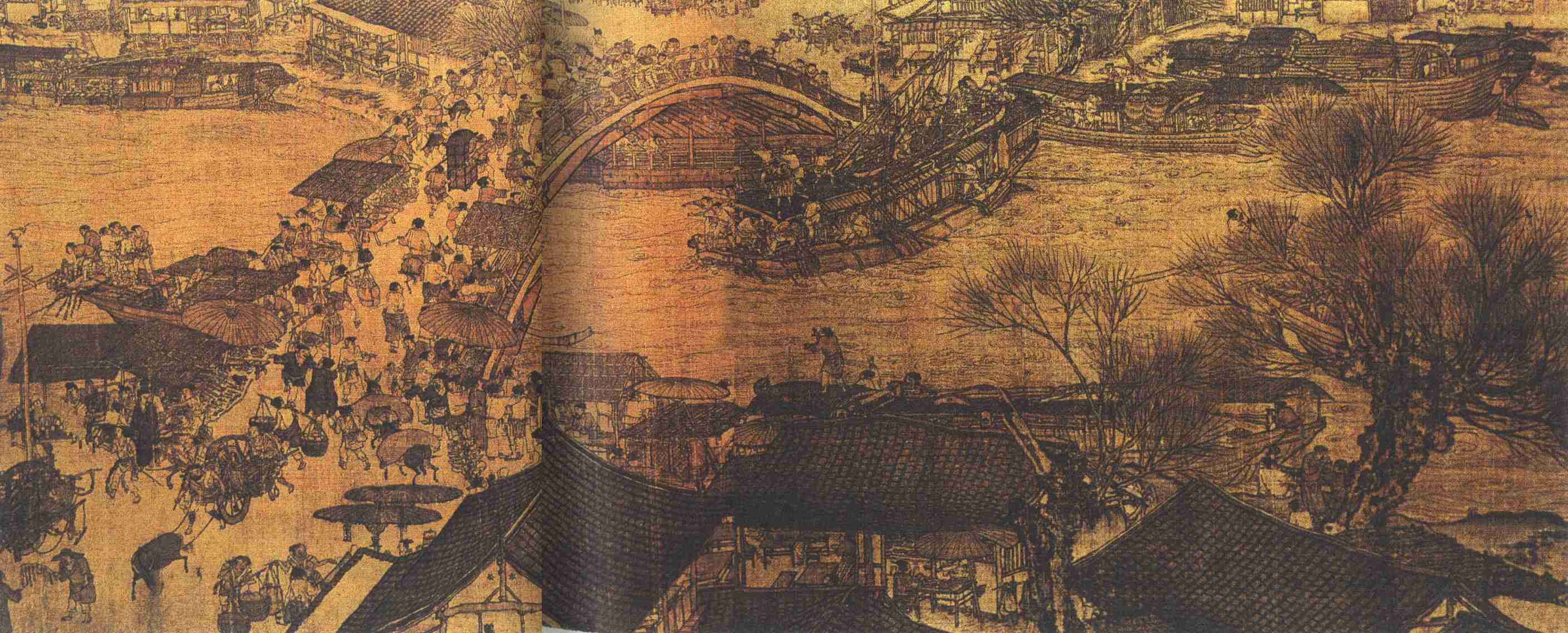 在斜跨画面的桥上和桥头的景象:路两旁有各式各样的摊贩,使人流更加拥挤。交通工具亦种类繁多,有载重的“串车”(一种独轮车,前后两人把驾,两旁两人扶拐,前有驴拽)正在下桥,有少年赶着驮粮的毛驴上桥,有两个小摊贩在路心争夺顾客。在桥顶有抬着女眷的小轿和骑马的官人对面而来,双方都有奴仆在前开路,互不相让。两边看热闹的人群,则在指指点点,或侧目闪避。这些既表现了交通要道和节日的气氛,更饱含戏剧性,这正是风俗画的鲜明特色。在桥头近处,一家大“脚店”门前,高耸的“彩楼欢门”惹人注意。门前有店伙们正搬走一串串钱币上车,暗示这脚店因地处要冲而生意兴隆。在画幅下方,接连一大片重叠的屋脊,显示了这脚店的规模,同时在构图上增加了画面下部的重量。在楼窗内,可以看到有顾客们和盛宴的餐桌,使这一部分,单纯而不觉空虚冷寂,并衬托出纷繁多变的中景和远景。