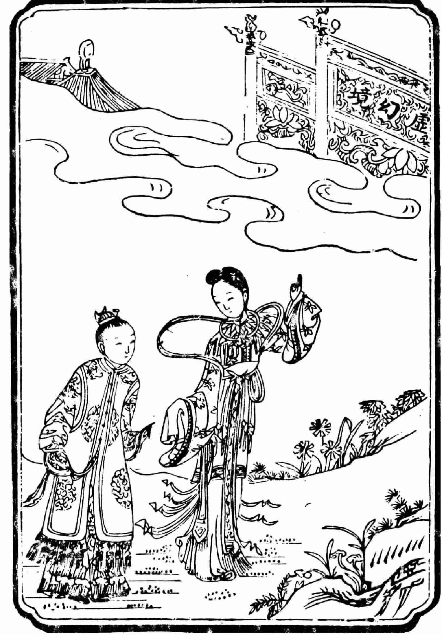 宝玉见是一个仙姑,喜的忙来作揖问道:“神仙姐姐不知从那里来,如今要往那里去?也不知这是何处,望乞携带携带。”那仙姑笑道:“吾居离恨天之上,灌愁海之中,乃放春山遣香洞太虚幻境警幻仙姑是也: 司人间之风情月债,掌尘世之女怨男痴。因近来风流冤孽,缠绵于此处,是以前来访察机会,布散相思。今忽与尔相逢,亦非偶然。此离吾境不远,别无他物,仅有自采仙茗一盏,亲酿美酒一瓮,素练魔舞歌姬数人,新填《红楼梦》仙曲十二支,试随吾一游否?”宝玉听说,便忘了秦氏在何处,竟随了仙姑,至一所在,有石牌横建,上书“太虚幻境”四个大字,两边一副对联,乃是: