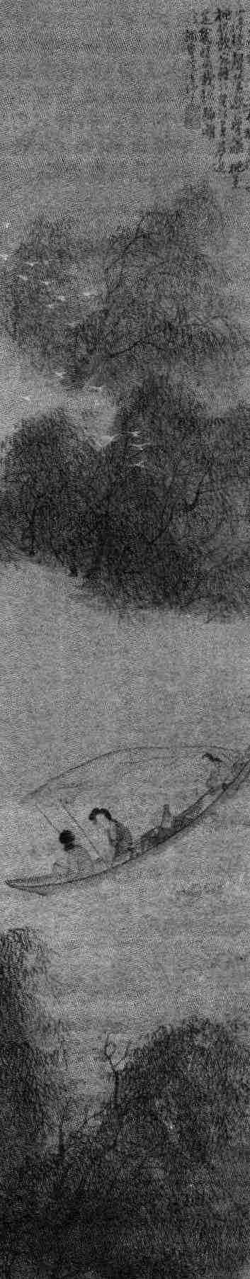 舟中女子的歌声是婉约的,形象是美好的,就在两船相遇的瞬间,他瞥到了她们美丽的容颜。船是运动的,想要仔细端详,肯定是不可能的,留在脑海中的,只能是短暂的印象。这印象是轻盈灵动、宛若飞花的歌扇,是神采飞扬、修长奇绝的蛾眉。画船女子的美丽暗示了合肥情人的绝人风姿,对她们的款款深情从这里自然地流露出来。