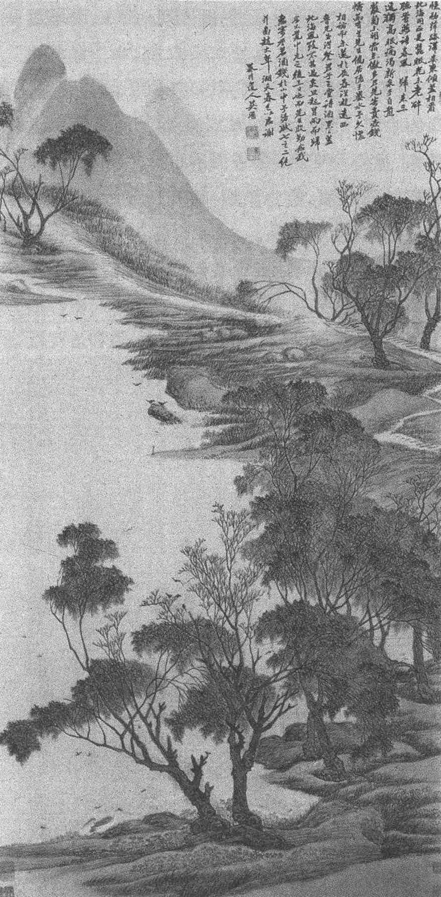 此画上有长题:“忆初萍迹滞娄东,倾盖相看北海同。正是蚕眠花未老,醉听莺燕语春风。归来三径独高眠,病渴新泉手自煎。丛菊未开露未傲,多君先寄卖壶钱。帱函有道先生侨居隐于娄水,予久怀相访而未遂,丙辰春从游远西鲁先生,得登君子之堂,诗酒累日,盖北海风致不甚过矣,旦起冒雨而归,今不觉中元之后三日也,而先生殷勤念我,惠寄香茗酒钱于山中,予漫赋七言二绝,并图赵大年湖天春色以志谢。墨井道人吴历。”