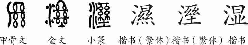 “湿”是会意字。甲骨文右边是两把晾着的丝,左边是水,会水将丝渗湿之意。金文在丝下另加土,表示土地潮湿。小篆整齐化。隶变后楷书写作“濕”和“溼”。汉字简化后写作“湿”。