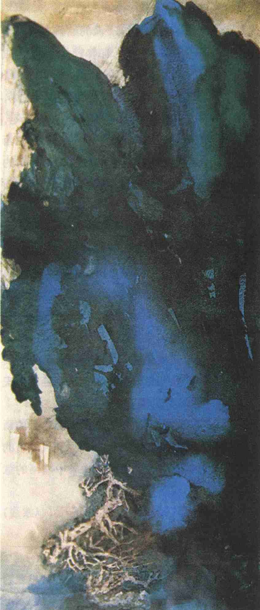 滟滪堆是三峡旧时著名的险滩,在四川奉节县东五公里瞿塘峡口,周围山势陡峻,水流湍急回旋。作者取意而略迹,以艺术夸张手法来表现对长江风物的现实感受,抒写自己的心境。画幅首先映入观众眼帘的是逼人眉睫的巨岩陡壑,彩墨兼施浸渖成整体气势。大块浓重的墨色,峰石犹如受云层遮蔽统一在暗部之中。落纸云烟,起伏随势,用深重色块对比衬托出小面积的空白来显示水域,风帆双双,隐现其间,起了“点睛”的作用。舟虚其下表现出云雾空濛的意趣。画面下方作盘曲枝桠,如游丝袅空穿插以为近景。山顶石面受光处施淡赭,稍事墨线勾勒。而天水以烘染来加强画面的气氛与云气掩映处相呼应。画面布局“一气贯串而不悖”,轻重抑扬,高低强弱,充满节奏感,颇有“天开风帆沧波里,峰峭深霾云雾中”的诗趣。