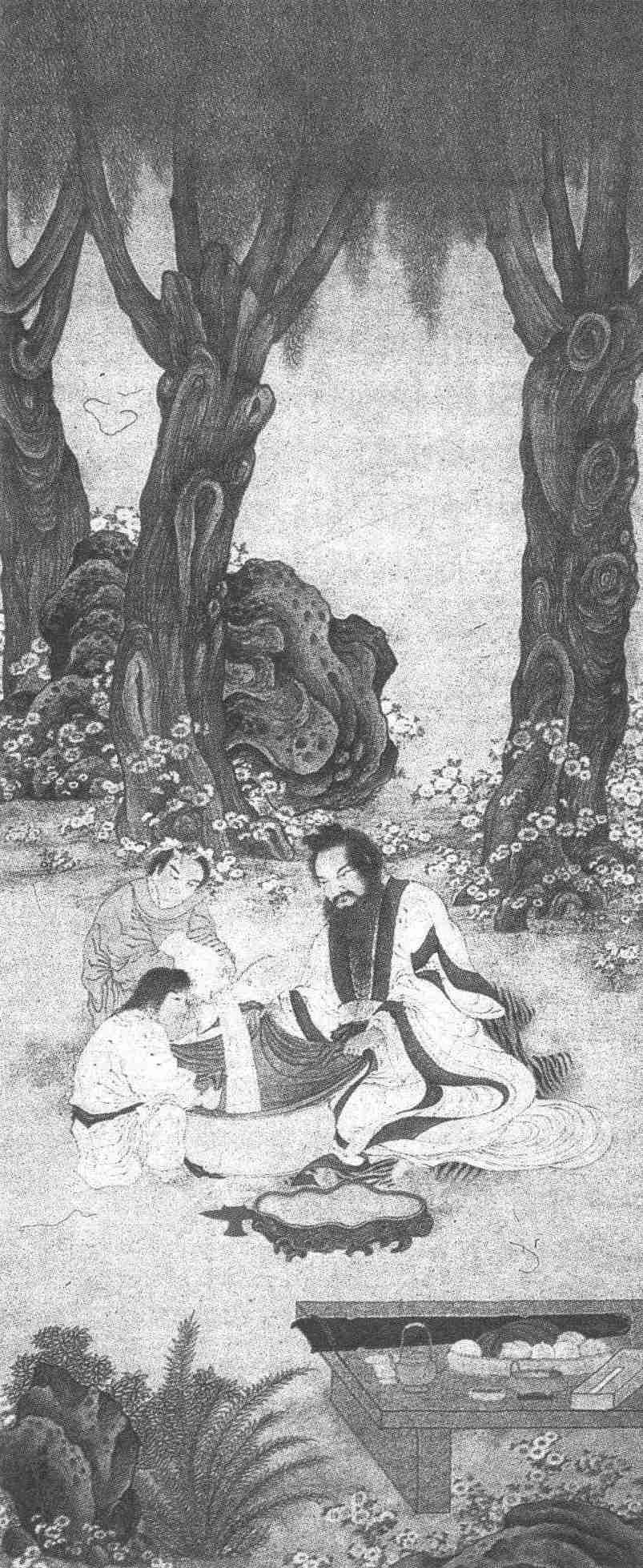 画面下方除坡石丛菊外,还安排了一张方案,上置古琴一张,仙桃一盘,书册一函,以及酒壶、酒杯、香炉等,一一点明了主人的兴趣和志向。《晋书》陶渊明传,称其性爱琴,不解音律,因蓄无弦琴一张,每朋酒之会,辄抚琴弄之,说是:“但识琴中趣,何劳弦上声。”其造意可想。图中所画,正是“大音希声”的无弦琴。陶渊明自撰《桃花源记》,极言世外桃源之胜,“夹岸数百步,中无杂树,芳草鲜美,落英缤纷”,春华秋实,图中的仙桃,当是桃花源中收获的硕果了。又撰《五柳先生传》,自述“好读书、不求甚解”,“性嗜酒”,“期在必醉”,图中的书册、酒具,又显然是其率真面目的绝妙写照。