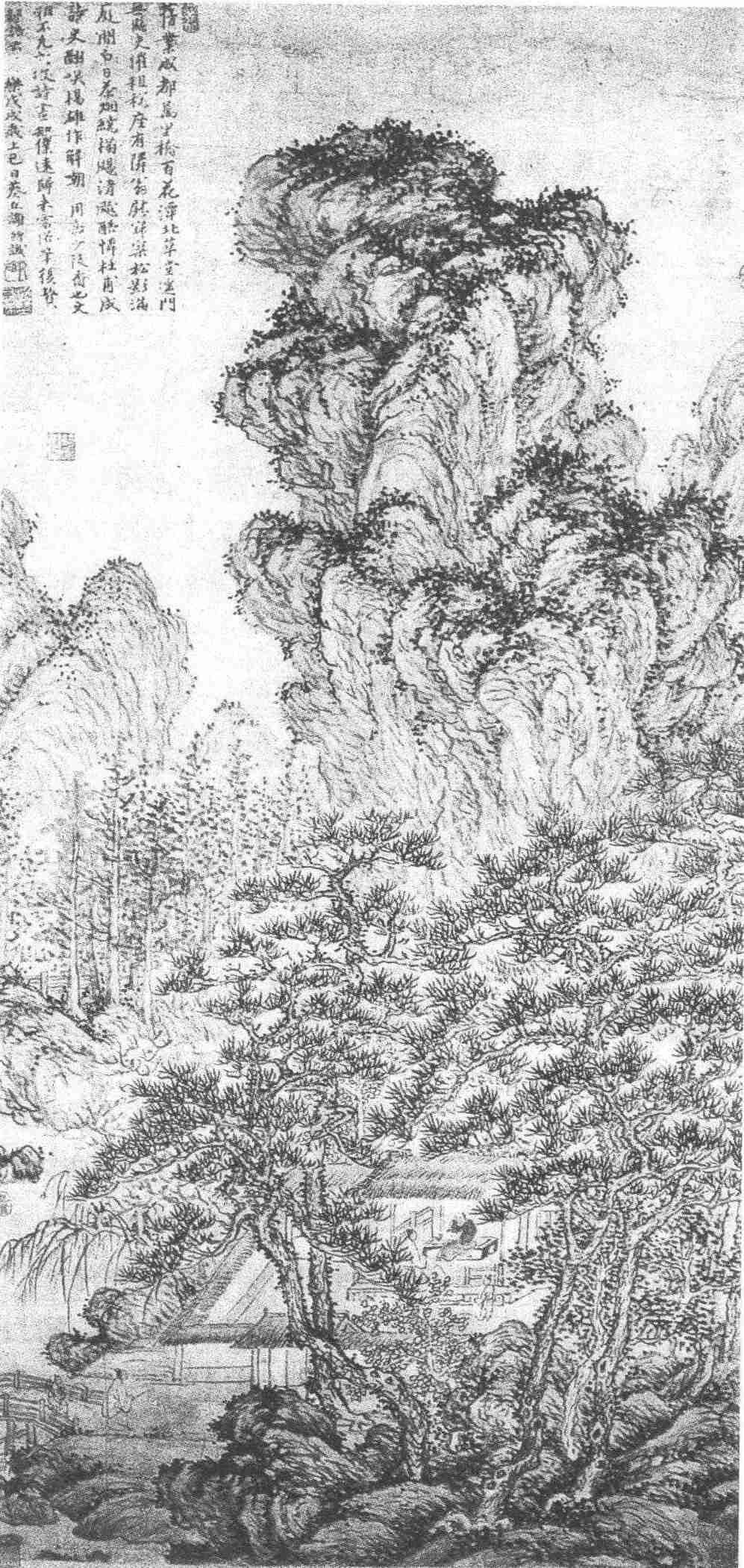 此图画法有王蒙遗意,逼塞而空灵的章法,苍郁而深邃的气势,茂密而蓬松的皴法,淡逸而清新的色调,与王氏《林泉清集图》相近。只是王作的格局更为恢宏大度,笔墨更为遒劲秀逸,这些是谢图所不逮处。