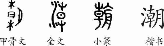 “潮”是会意兼形声字。甲骨文是日出林中而月未落的样子,会早晨之意。金文将月讹为水,用日出草间会早晨的潮水之意。小篆整齐化。隶变后楷书写作“朝”和“潮”。如今二字表意有分工。