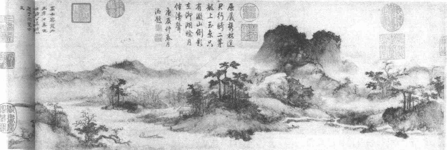 李升,濠梁(今安徽凤阳)人。晚年移家澱湖,“善写竹石,尤工平远山水,识者谓其源出王维”(见乾隆《青浦县志》)。此卷云水飞动,以点簇皴渲并用,描绘峰岚石色。此种技法,或即源自王维之“破墨山水”。