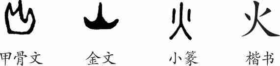 “火”是象形字。甲骨文的字形像一团燃烧的火焰。金文将甲骨文填实了。小篆线条化,还保留了一点向上的火苗之形。隶变后楷书写作“火”。