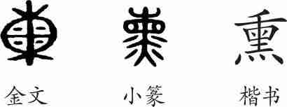 “熏”是会意字,金文上面像火烟冒出,中间是烟囱,四点表示烟苔,下面是火焰,会烟囱冒烟之意。隶变后楷书写作“熏”。