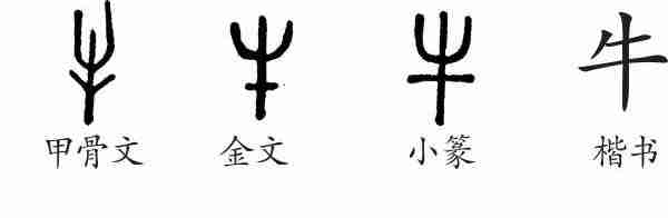 “牛”是象形字。甲骨文像正面看的牛头之形。金文大致相同。小篆整齐化。隶变后楷书写作“牛”。