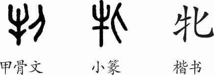 “牝”是会意兼形声字。甲骨文从牛,从匕(雌性标志),会雌性鸟兽之意,匕兼表声。小篆整齐化,并将牛移到左边。隶变后楷书写作“牝”。