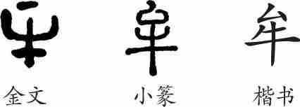 “牟”是指事字。金文从牛,上部像牛鸣的声气从口里出来之形,表示牛叫声。小篆整齐化。隶变后楷书写作“牟”。