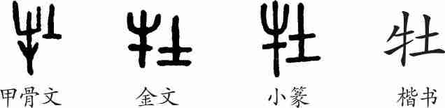 “牡”是会意兼形声字。甲骨文和金文左边是“牛”,右边是“士”(雄性动物的生殖器),会雄性动物之意。小篆整齐化,但“士”讹为“土”,土表声。隶变后楷书写作“牡”。