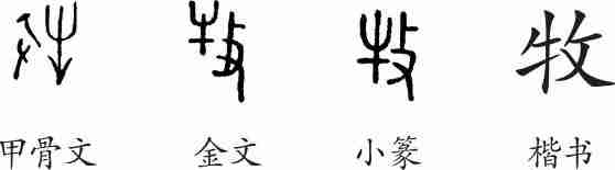 “牧”是会意字。甲骨文像拿着木棍赶牛。金文将“牛”放在了左边。小篆是由金文演变而来。隶变后楷书写作“牧”。