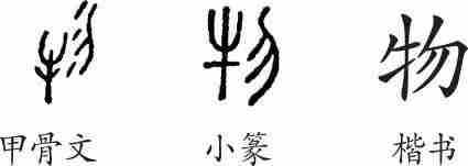 “物”是会意兼形声字。小篆从牛从勿(色彩)会意,勿兼表声。隶变后楷书写作“物”。
