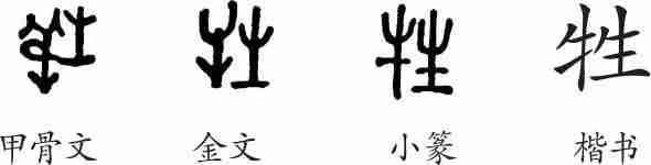 “牲”是形声字。甲骨文左边为一只捆绑的羊,右边从生。金文从牛,从生。隶变后楷书写作“牲”。
