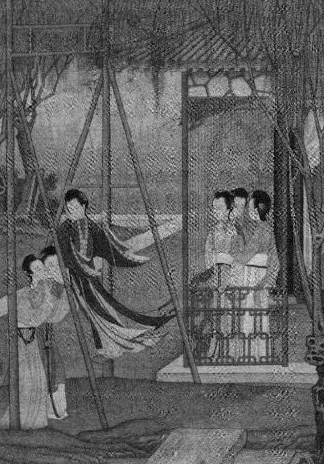 上片写少女荡秋千的场景。作者略去了荡秋千的过程,直接从“蹴罢”落笔,“慵”字写出了玩后的倦意,透露出嬉戏之欢畅。“纤纤手”语出《古诗十九首》:“娥娥红粉妆,纤纤出素手”,“露浓”句表明了时令:春日之晨,与女子美丽的年华韶光不觉暗合,“花瘦”亦“人瘦”也。薄汗润湿了罗衣,极写活动之尽兴。“蹴罢”的一瞬间,虽是一副倦容,映入读者脑海的却是一活泼、灵动的形象,秀发飞舞,罗衣翩跹,词人宛如自在欢乐的小鸟,与秋千一同轻飏,飞翔。